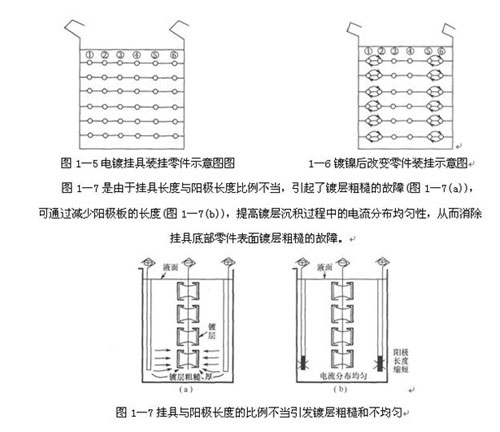 有些電鍍故障,經(jīng)常出現(xiàn)在零件的固定部位或掛具某些部位的零件上。出現(xiàn)這種現(xiàn)象時(shí),可以用改變零件的裝掛位置或裝掛方向,來觀察故障現(xiàn)象是否隨裝掛位置(或方向)的改變而改變,如圖1-5所示某塑料鍍鉻零件裝掛。在鍍鉻時(shí)經(jīng)常在掛具左邊或右邊最外面一排零件出現(xiàn)棕褐色鉻層。出現(xiàn)故障后,一直認(rèn)為這種故障是鍍鉻過程中產(chǎn)生的,所以就一直采取處理鍍鉻溶液的方法,但半年多都沒有排除故障,后來用改變零件裝掛位置進(jìn)行試驗(yàn),發(fā)現(xiàn)故障起源于鍍鉻以前。故障現(xiàn)象出現(xiàn)在第1排或第6排零件上(偶爾也不出現(xiàn)這種故障),通過改變零件裝掛位置尋找故障的起源,將鍍好光亮鎳后的第1排與第2排的零件交換位置;第6排與第5排的零件交換位置(圖1-6)。改變裝掛位置以后進(jìn)行鍍鉻,故障現(xiàn)象不是出現(xiàn)在最外面一排,而是出現(xiàn)在第2排或第5排的零件上。說明故障起源于鍍鉻以前,與鍍鉻液無關(guān)。經(jīng)過多種方法試驗(yàn),最后找出來是光亮鎳鍍好以后出槽時(shí),一個(gè)掛具零件還在電鍍,這一掛具出槽時(shí),靠近電鍍掛具的出槽零件表面產(chǎn)生了雙性電極而造成的。可見這一起故障,若不用改變零件裝掛位置進(jìn)行試驗(yàn),故障的起因就很難找到。
